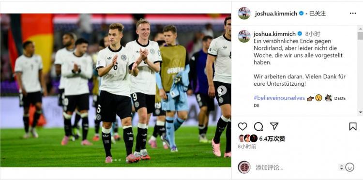 基米希社媒晒出赛后谢场的照片,并写道:“对阵北爱尔兰的比赛取得了不错的结果,但遗憾的是,这样的一周并不是我们所有人期待的。我们正在努力。非常感谢大家的支持!”