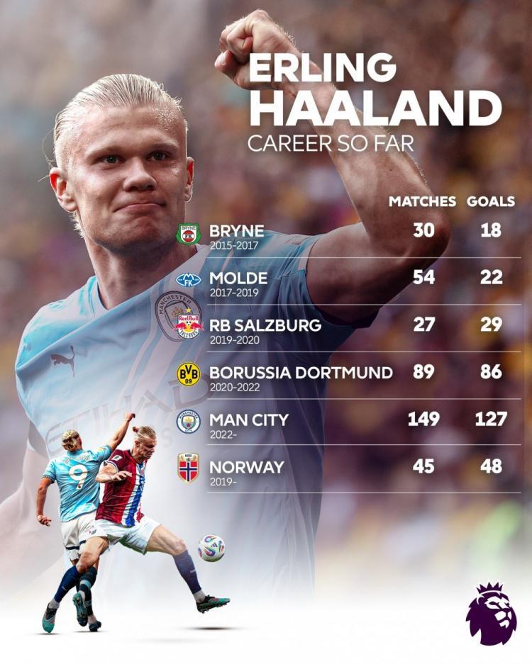 直播吧9月11日讯 英超官方统计了哈兰德职业生涯至今进球的分布,并晒出数据图片,哈兰德在曼城149场127球,在挪威队45场48球。
