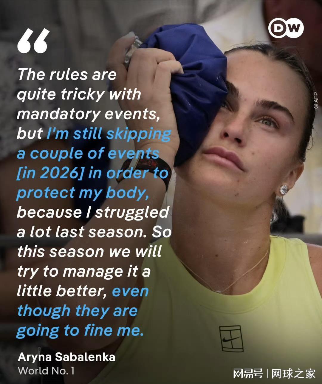 尽管面临处罚风险,萨巴伦卡依然坚持会选择性跳过一些比赛,以保护自己的身体。“上个赛季我真的很挣扎,因为我参加了一些比赛时身体状况很差,或者因为过度比赛而筋疲力尽,”她坦言。