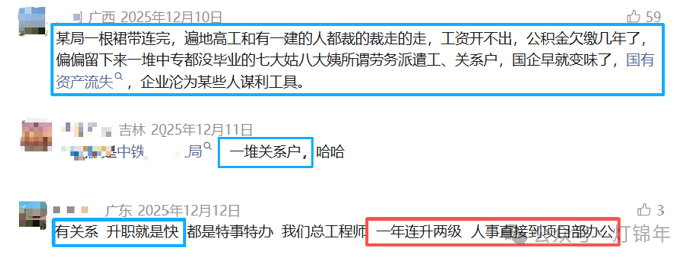 有人说中T某局也是一堆关系户,还有人说某局一根裙带连完,有能力有证书的人都被裁员了,留下一堆低学历没技术的关系户;