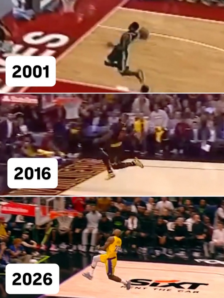 詹姆斯转发了媒体发布的他分别在2001年、2016年及2026年完成招牌式抢断后大风车扣篮的对比画面。