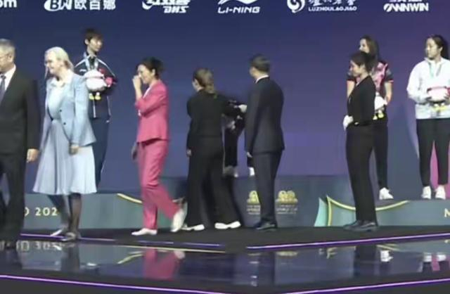 显然当天的活动,刘诗雯给申裕斌、王曼昱、孙颖莎进行了女单比赛的颁奖,并且在期间和孙颖莎互动,喊话孙颖莎继续加油,而在两个人互动的时候,刘诗雯还偷偷的拍打了一下孙颖莎,小枣对于 孙颖莎的宠溺之情可见一斑。